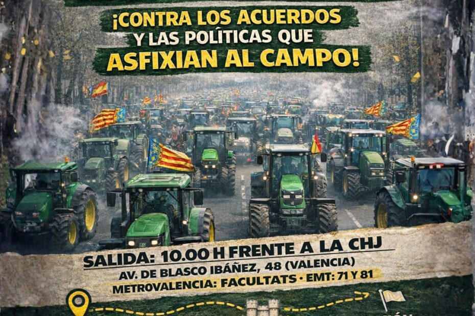 El sector agrario de la Comunitat Valenciana convoca una tractorada y manifestación el 29 de enero en Valencia, dentro del ‘superjueves’ de protestas en toda España, para denunciar los acuerdos comerciales sin reciprocidad, los recortes de la PAC y la burocracia que amenaza la viabilidad del campo.