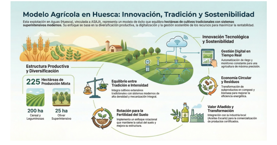 Esta combinación permite diversificar la producción, integrar secano y regadío y optimizar recursos tanto a nivel agronómico como económico, en un entorno —la Hoya de Huesca— con condiciones favorables y buena accesibilidad.