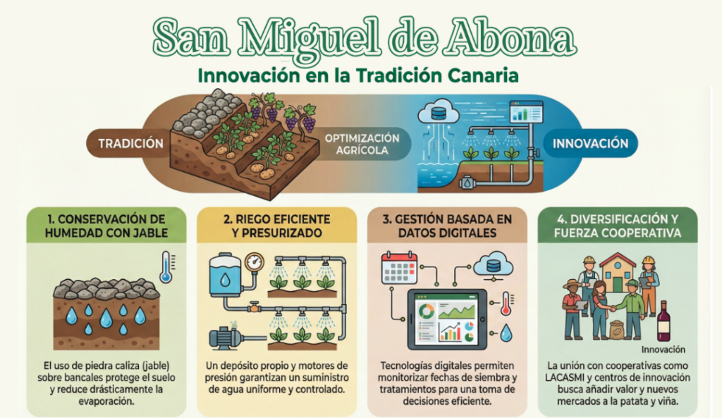 En San Miguel de Abona (Tenerife), esta explotación agrícola es un buen ejemplo de adaptación al medio, gestión eficiente del agua y aprovechamiento de los recursos locales en un entorno especialmente condicionado por el clima.