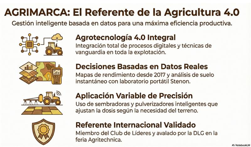 El principal sello de esta explotación es su enfoque de “Agrotecnología 4.0”, con digitalización aplicada a todas las fases del trabajo: desde la cosecha hasta la siembra y los tratamientos. Entre sus herramientas clave destacan: