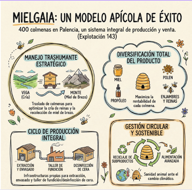 En la provincia de Palencia, con base en Husillos, esta explotación apícola se ha consolidado como un modelo muy completo para aprender el oficio “de verdad”: maneja entre 350 y 400 colmenas según la época del año y trabaja con varios colmenares repartidos entre Dueñas, Palencia, Husillos y Fuentes de Valdepero, además de un traslado estacional a Valles de Valdavia para producir miel de brezo.
