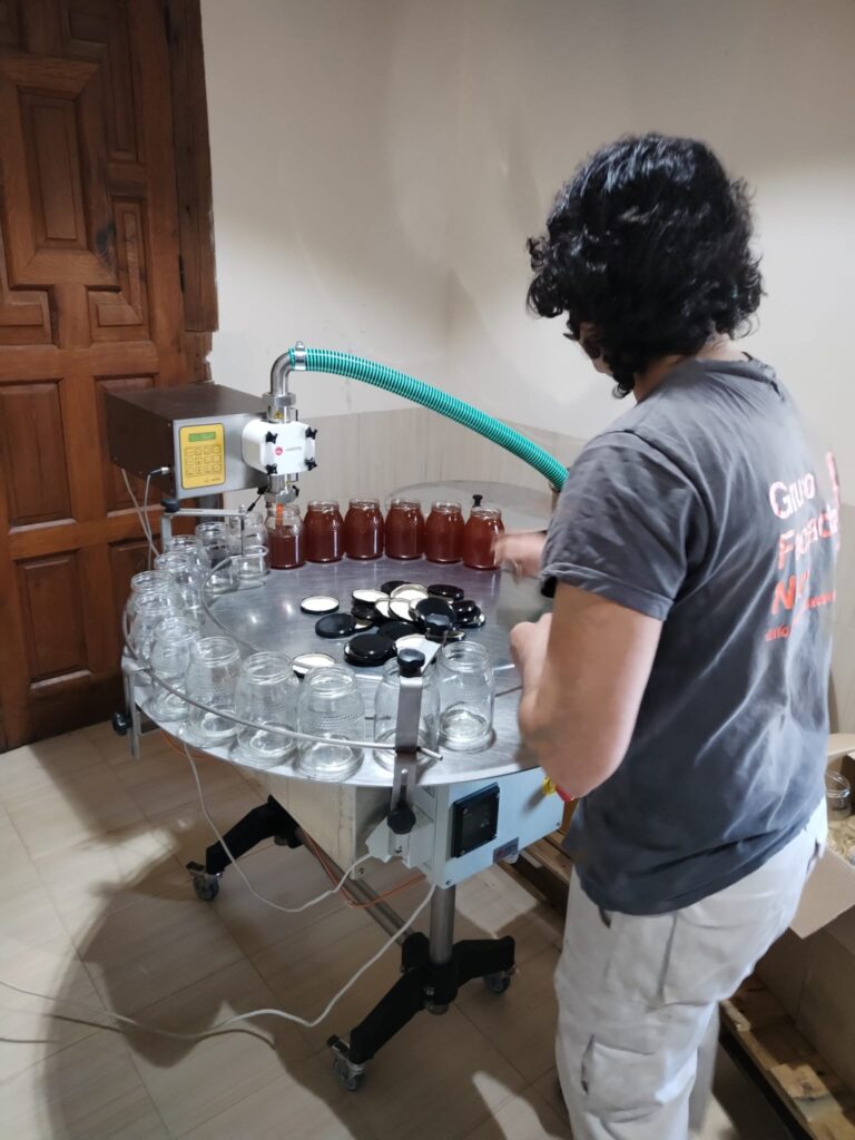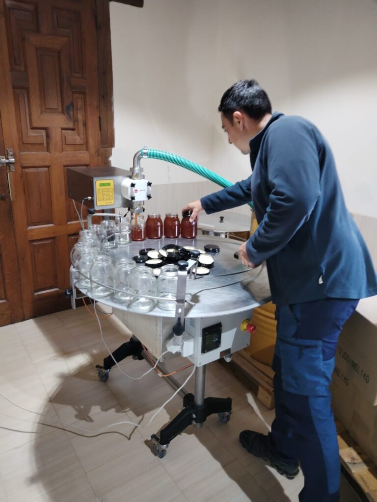 Pies de foto: Roberto San Martín Pardo anfitrión de la explotación. Envasando la miel