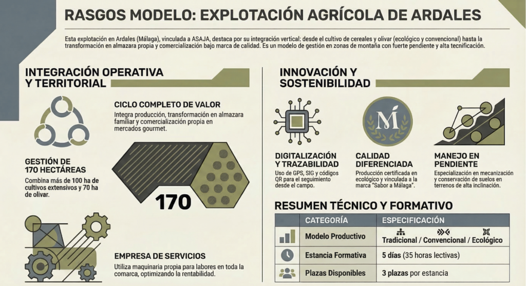 Las estancias del programa tienen 5 días (35 horas) y 3 plazas que Incluyen contenidos centrados en gestión económica, digitalización, mecanización adaptada a pendientes, manejo del suelo para evitar erosión y calidad diferenciada del aceite. La formación se completa con una visita técnica a la Almazara Aceites de Ardales, orientada a conocer cómo retener valor añadido mediante la comercialización propia.