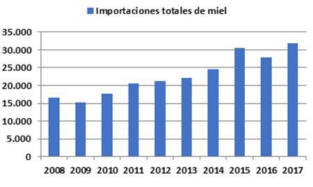 En la última década, el aumento de las importaciones de miel a España ha sido exponencial: de las 15.269 toneladas en 2009, a las 31.871 toneladas del último año, lo que supone un aumento del 109%. Los datos oficiales de la campaña 2017 recogen que la situación lejos de estabilizarse sigue agudizándose con un crecimiento de las importaciones del 14% en 2017 con respecto a 2016.