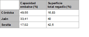 De este modo, si se establece una comparativa entre las tres provincias relacionando ambos porcentajes en una tabla, se comprueba la asimetría existente para la provincia de Córdoba en cuanto a capacidad de agua embalsada y superficie de riego existente en dicha provincia.