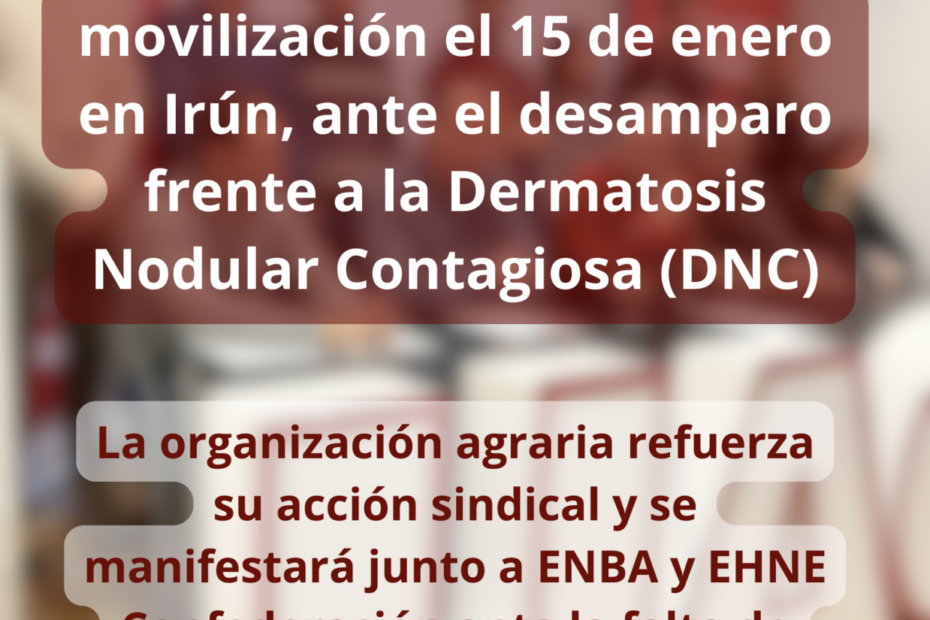 El sector ganadero dice basta a la pasividad de las administraciones frente a la Dermatosis Nodular Contagiosa (DNC), con una protesta en la frontera de Irún el próximo 15 de enero, convocada por UAGN, ENBA y EHNE Confederación. Las organizaciones agrarias alertan de la grave preocupación existente entre las personas ganaderas ante una gestión sanitaria deficiente y una falta de protección institucional que puede derivar en vaciados sanitarios indiscriminados, con consecuencias económicas y sociales irreversibles, especialmente en las zonas fronterizas.