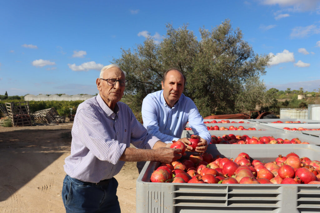 Originario de Valverde, otra pedanía del Camp d’Elx, creció en una familia de agricultores y recuerda cuando las mulas araban la tierra y los cultivos principales eran almendro, algarrobo, habas y tomates. “Cuando llegó el Trasvase Tajo–Segura fue una auténtica revolución”, afirma, destacando su impacto en la prosperidad de las pedanías y, en particular, de los cítricos. A sus 83 años, se enorgullece de que su hijo, Roque Bru—miembro de la junta directiva de ASAJA Alicante y presidente de Riegos de Levante—continúe al frente de las fincas familiares.