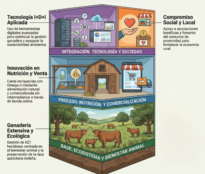 Otro punto diferencial es el trabajo con raza Avileña en el Valle de Alcudia, inscrita en la Asociación Española Raza Avileña-Negra Ibérica, y la colaboración con la Universidad de Castilla-La Mancha en el desarrollo del proyecto comercial.