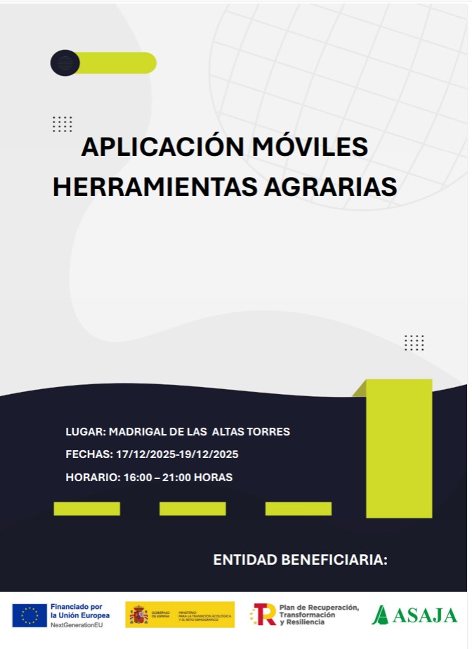 El curso “Aplicación móviles herramientas agrarias se celebrará en Madrigal de las Altas Torres (Avíla) del 17 al 19 de diciembre de 2025. Se impartirá en horario de 16.00 a 21.00, con una duración total de 15 horas presenciales. Está dirigido a personas con conocimientos básicos en el uso de aplicaciones.