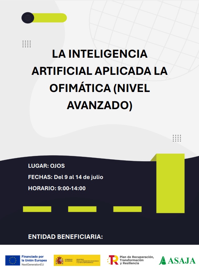 El curso “La inteligencia artificial aplicada a la ofimática (nivel avanzado), se desarrollará en Ojós (Murcia) los días 09 de julio y 14 de julio de 2025, en horario de 9:00 a 14:00 h y con una duración total de 10 horas presenciales, estará dirigido a personas con nivel avanzado en ofimática.