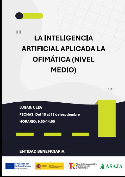 El curso “La inteligencia artificial aplicada a la ofimática (Nivel medio)”, se desarrollará en Ulea (Murcia) del 15 al 18 de septiembre de 2025, en horario de 9:00 a 14:00 h y con una duración total de 15 horas presenciales, estará dirigido a personas con nivel medio en ofimática.