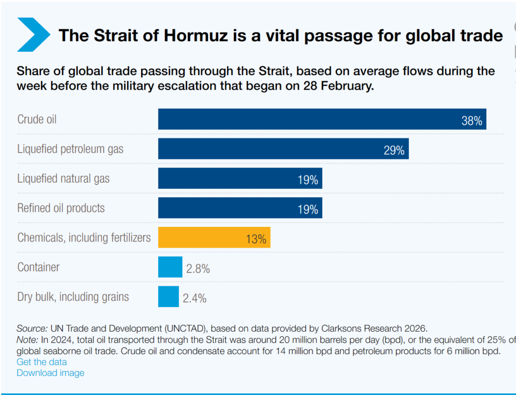El conflicto en curso que afecta a la región del Estrecho de Ormuz está perturbando los flujos de energía y fertilizantes, con impactos medibles en los costos y riesgos crecientes para los sistemas alimentarios, el comercio y las economías vulnerables.