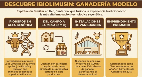 En Ibio (Cantabria), el Grupo Ibiolimusin se ha consolidado como una explotación de referencia por una combinación poco común: mejora genética sostenida, instalaciones modernas, manejo orientado al bienestar animal y una apuesta clara por acercar el producto al consumidor a través de una carnicería propia con filosofía “km 0”.