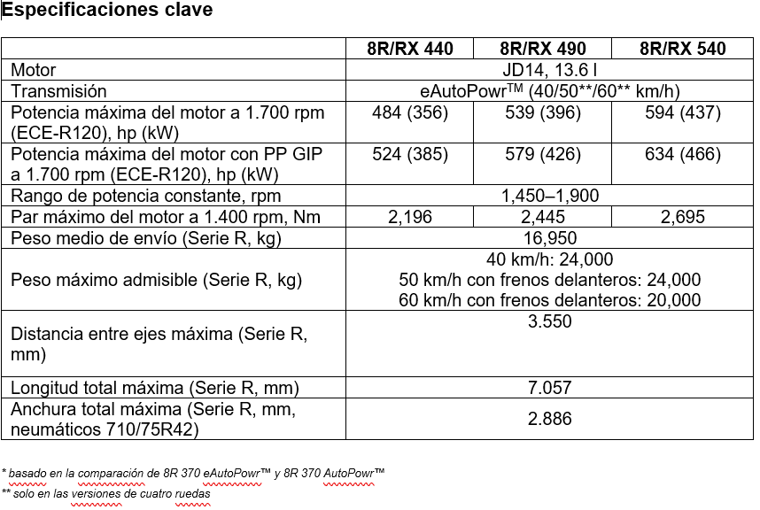 John Deere incorpora tres nuevos modelos de tractores de alta potencia a sus series 8R y 8RX, con potencias nominales del motor de 440 hp, 490 hp y 540 hp. Los modelos están diseñados para las exigencias de los trabajos de tiro pesado y las largas jornadas típicas de las grandes explotaciones agrícolas europeas. Todos los modelos están equipados con el motor JD14 de 13,6 l, capaz de entregar hasta 634 hp mediante el sistema Potencia Pico de la Gestión inteligente de Potencia (PP GIP). Esto convierte al modelo superior 8R/8RX 540 en el tractor de diseño estándar más potente del mundo.
