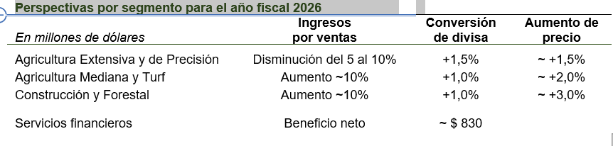 El aumento de las ventas del segmento de Agricultura Mediana y Turf en el cuarto trimestre responde a un mayor volumen de envío. El beneficio operativo disminuyó por el aumento de los aranceles, de los gastos de garantía y de los costes de producción.