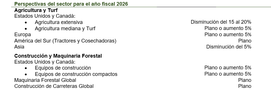 Deere & Company prevé que el beneficio neto para el año fiscal 2026 oscile entre 4.000 y 4.750 millones de dólares. “De cara al futuro, estimamos que 2026 marcará el punto más bajo del ciclo para el segmento de Agricultura Extensiva. Los aranceles continuarán presionando los márgenes y seguiremos afrontando desafíos en el segmento de Agricultura Extensiva. No obstante, nuestro compromiso con la gestión de inventarios y el control de costes y las previsiones de crecimiento en los segmentos de Agricultura Mediana y Turf y de Construcción y Maquinaria Forestal, colocan a la compañía en una buena posición para gestionar el negocio de forma efectiva y aprovechar nuevas oportunidades conforme las condiciones del mercado se recuperan”, concluye John May.