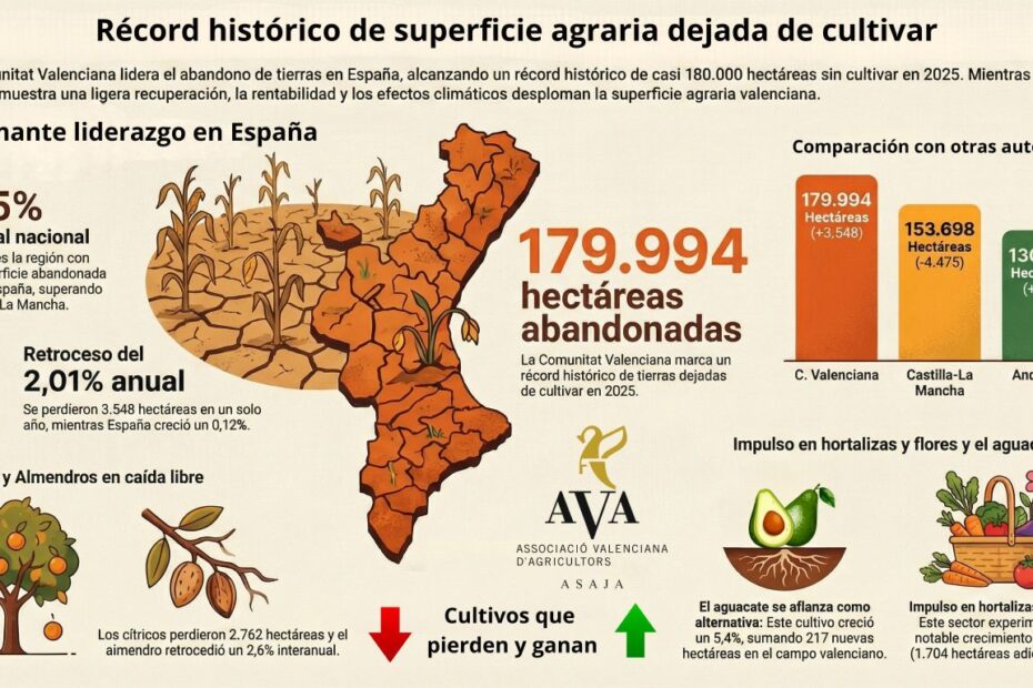 Un estudio elaborado por la Asociación Valenciana de Agricultores (AVA-ASAJA), a partir de la encuesta Esyrce del Ministerio de Agricultura, revela que la Comunitat Valenciana dejó de cultivar 3.548 hectáreas en 2025 -lo que implica un retroceso interanual del 2,01%- y batió el récord histórico de tierras abandonadas con 179.994 hectáreas de cultivo. AVA-ASAJA atribuye este hecho a la sostenida crisis de rentabilidad en la mayoría de las producciones agrarias y a los devastadores efectos de la DANA, que arrasó parcelas situadas junto a cauces desbordados, por lo que reclama a las administraciones un cambio de rumbo de las políticas agrarias.