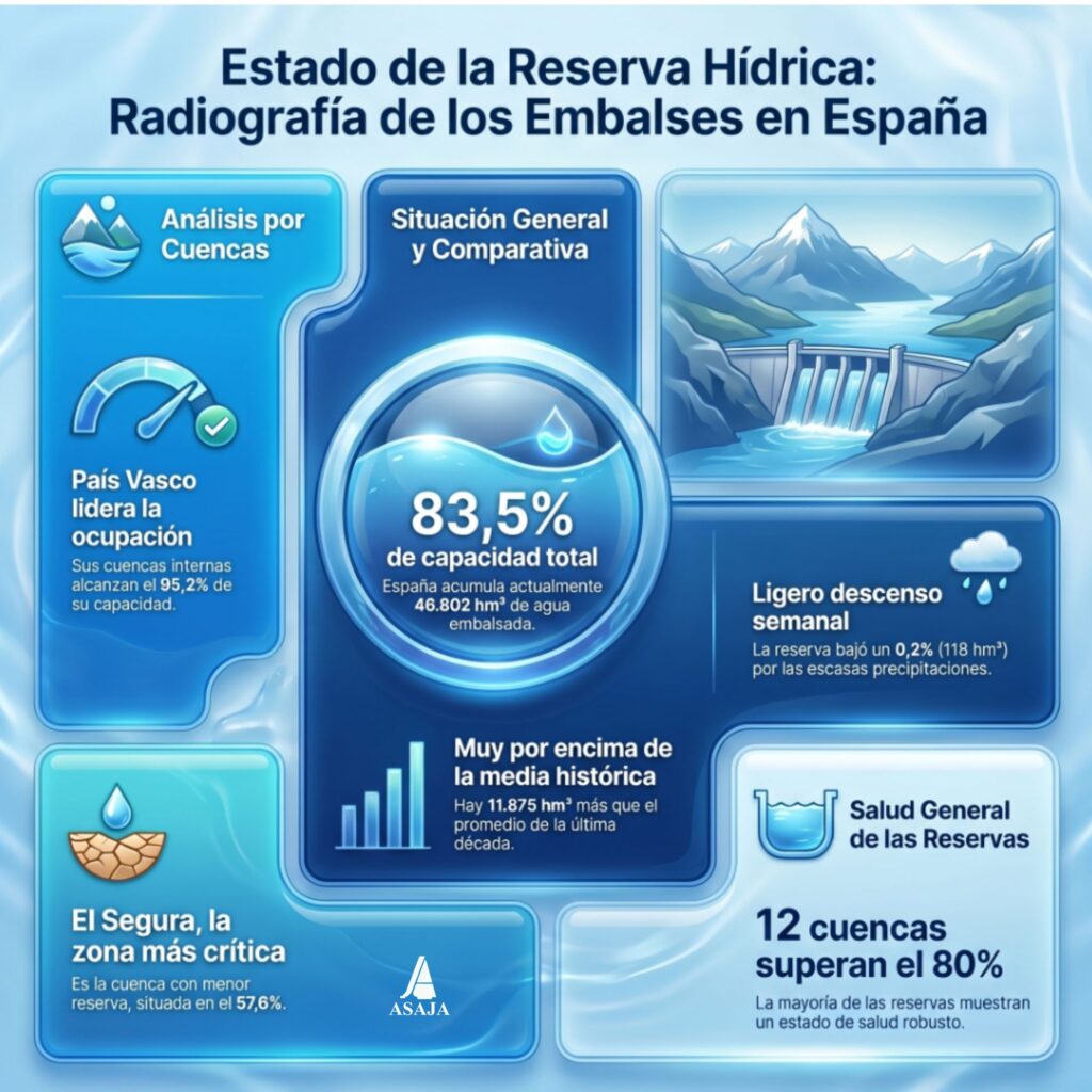 La reserva hídrica desciende al 83,5 % de su capacidad, con 46.802 hectómetros cúbicos