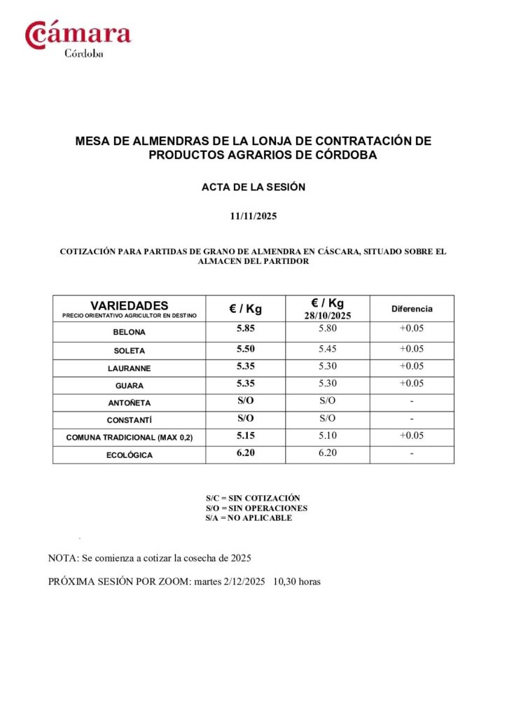 Lonja de Almendras. Córdoba11 de noviembre de 202517 de noviembre de 2025 Mesa de almendras. Cotización para partidas de grano de almendra en cáscara, situado sobre el almacén del partidor. anteriorINTERPORC refuerza en China la defensa del porcino español durante el viaje de Estado del Rey Felipe VIsiguienteASAJA pide máxima atención a las medidas de bioseguridad