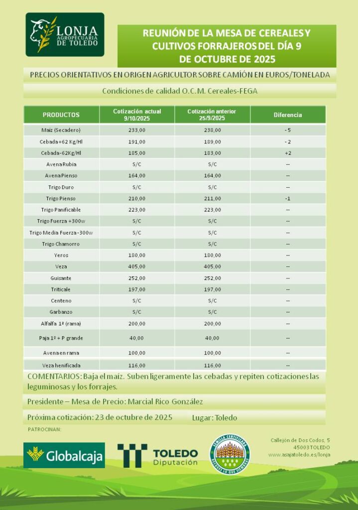 Lonja de Toledo9 de octubre de 202510 de octubre de 2025 Lonja Agropecuaria para la Mancha sesión del día 09 de octubre de 2025 anteriorLonja de AlbacetesiguienteCataluña dispone ya de las primeras dosis para vacunar frente a la Dermatosis Nodular Contagiosa