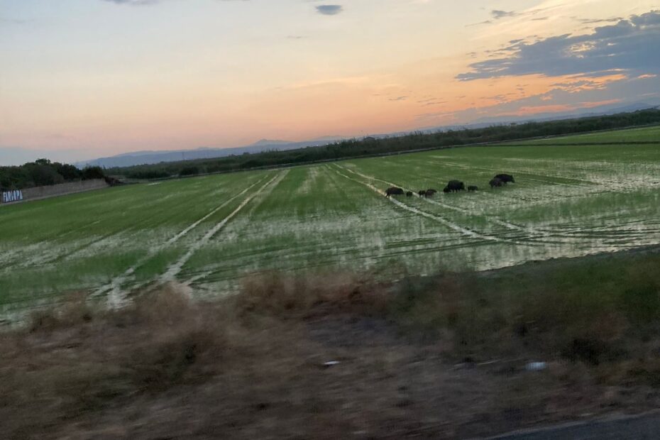 Anoche fueron fotografiados una decena de jabalís en un campo situado cerca del parque de bomberos de El Saler. El responsable de la sectorial del arroz de AVA-ASAJA, José Pascual Fortea, señala que “las piaras de jabalís, que crían y se multiplican muy deprisa, están llegando a los arrozales desde los campos abandonados más cercanos y la Dehesa de El Saler, donde debido a la sequía y los incendios el bosque no les provee suficiente agua y comida. El principal daño que pueden provocar sobre el cultivo consiste en que los jabalís se revuelquen en campos ya espigados, causando la muerte de las plantas y la pérdida de la producción en las zonas afectadas”.