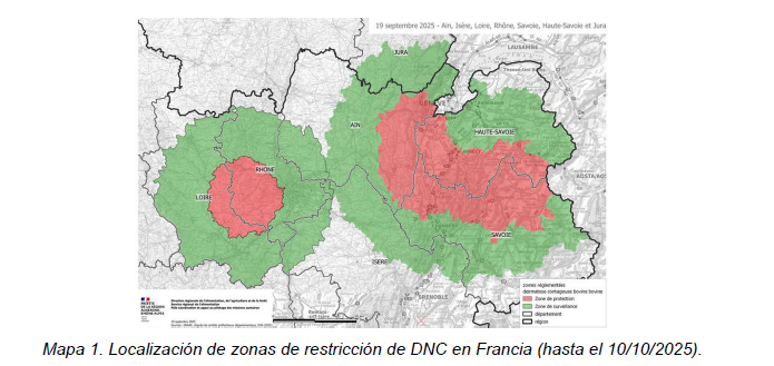 El sábado 11 de octubre de 2025, los Servicios Veterinarios Oficiales de Francia notificaron un nuevo foco de Dermatosis Nodular Contagiosa (DNC) en una explotación de 93 bovinos ubicada en el municipio de Écleux, en el Departamento de Jura. ​ Este caso marca la aparición de la enfermedad en una zona previamente libre, lo que ha llevado a las autoridades francesas a establecer una nueva Zona de Restricción de 50 km y a planificar una campaña de vacunación de emergencia para contener su propagación. ​