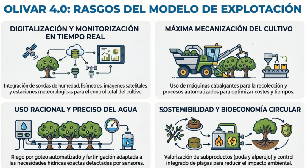 A esto se suma un enfoque claro hacia la mecanización total. La recolección se realiza con máquinas cabalgantes y el fruto se transporta a una planta industrial para su procesamiento, dentro de un circuito de bioeconomía circular que conecta producción, manipulación y transformación. El propio documento subraya que este modelo requiere mano de obra altamente cualificada, con formación técnica y mayor valor profesional.