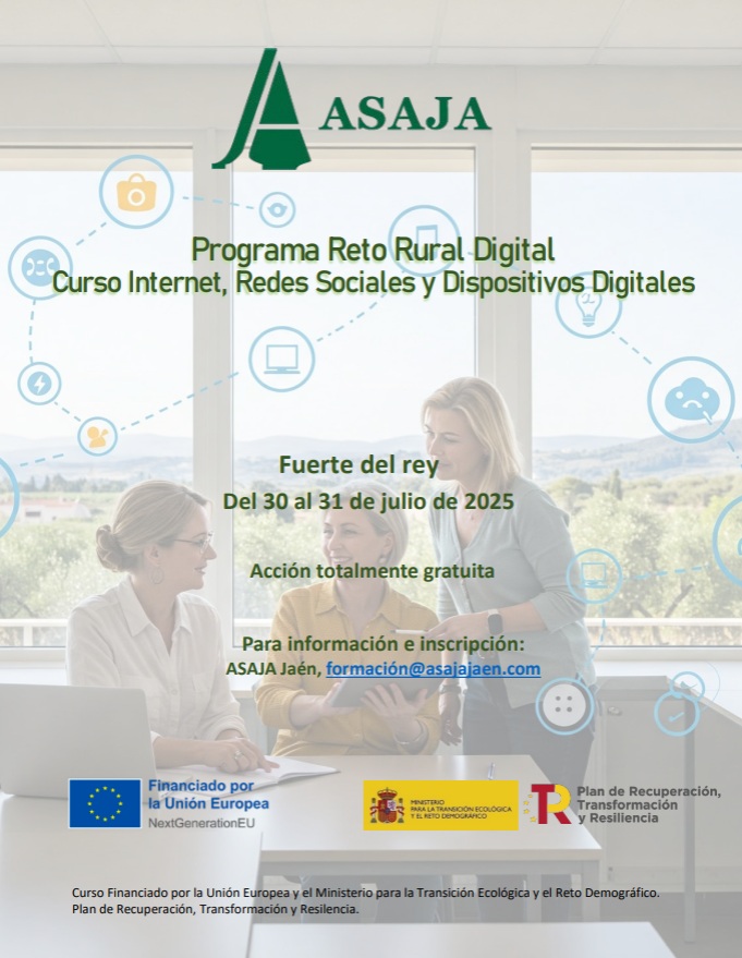 El curso “Internet, Redes Sociales y Dispositivos Digitales”, se desarrollará en Fuerte del Rey (Jaén) los días 30 y 31 de julio de 2025, en horario de 16:00 a 21:00 h y con una duración total de 10 horas lectivas en modalidad presencial.