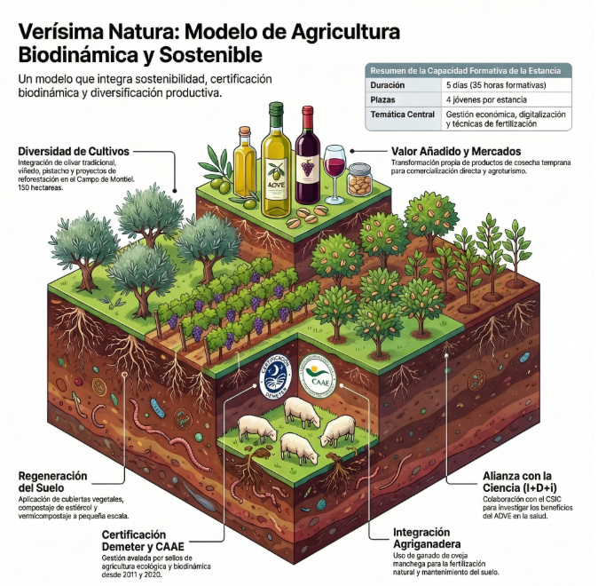 Agricultura ecológica y biodinámica certificada: la finca está certificada en agricultura ecológica (CAAE) y en biodinámica (Demeter), con experiencia directa en la implantación de este modelo y en la preparación y superación de auditorías tanto en campo como en comercio.